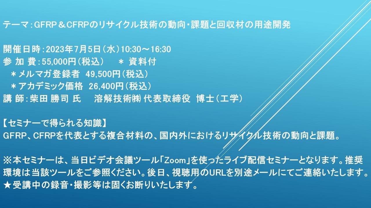 【ライブ配信セミナー】GFRP&CFRPのリサイクル技術の動向・課題と回収材の用途開発 7月5日(水)開催 主催:(株)シーエムシー・リサーチ