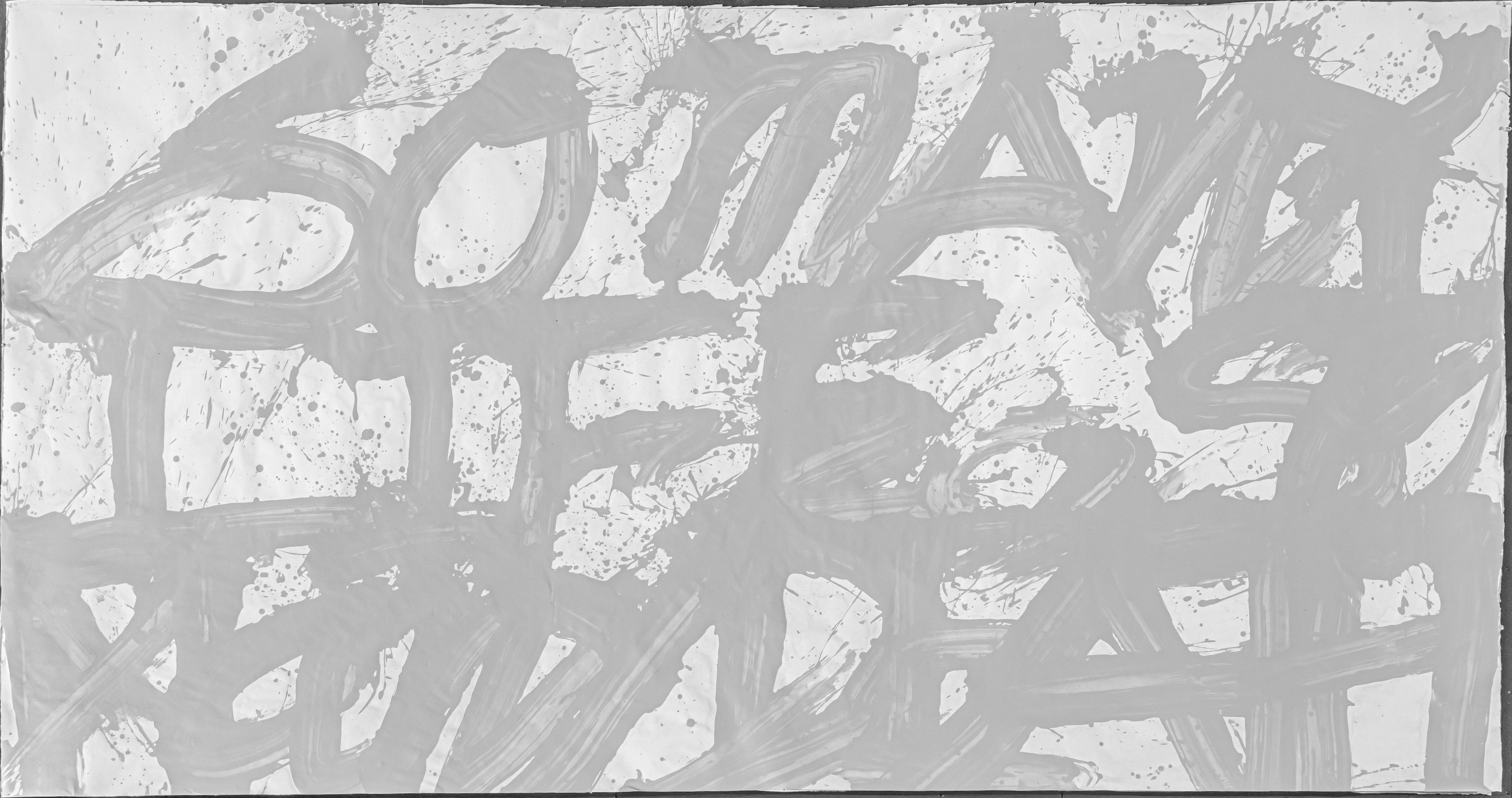 ハシグチリンタロウ君に出会ったのは3年ぐらい前だが、その時からコイツはただモノではな い!と思った。 彼を書道や絵画の逸脱と評価するむきもあろうが、僕には「速度」のアーティス トである。 呪力は魔を祓う力であり、呪いをふり切る速度でもあるだろう。 そして意味もふり 切る速度なのだ。彼の高速なアートはダイレクトに神経にガツンとくるエナジーそのものだ。