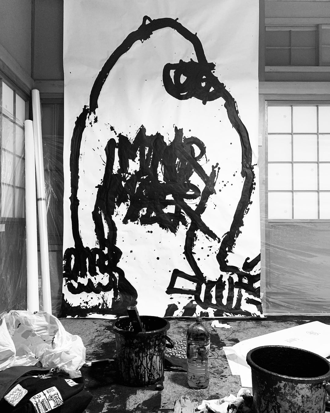 ひと目見た瞬間から忘れられない強烈なインパクトを与えるアルファベットとダイナミックな作風が印象的なハシグチリンタロウ。戦後前衛芸術に影響を受け、20代より地元九州を拠点に活動し、パンクロックを聞きながら筆記具に筆ではなくタオルを使って制作を続けます。