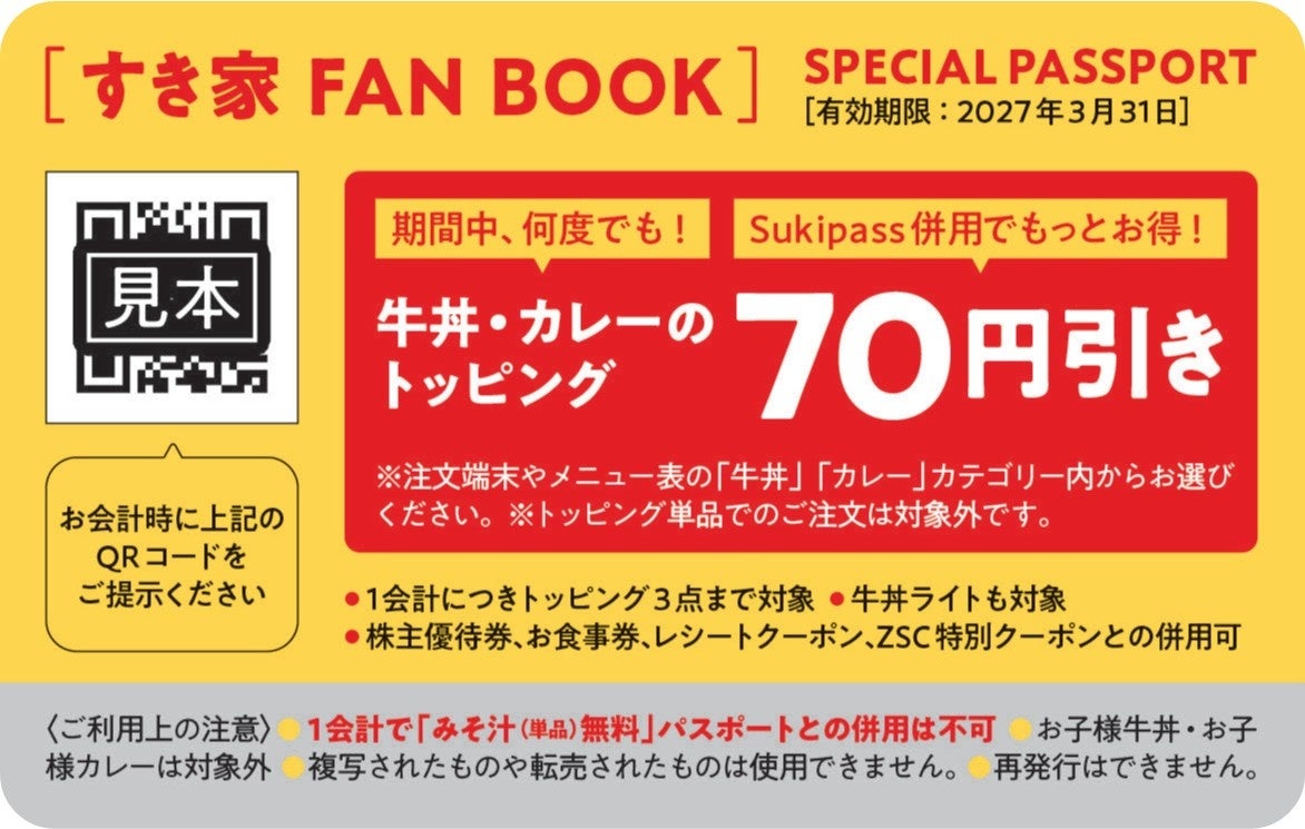 本誌の特別付録は、「お好きな牛丼・カレーのトッピングが70円引き・またはみそ汁(単品)が無料」になるスペシャルパスポートです。2027年3月31日まで何度でも使用できます。さらに、すき家で購入可能な「Sukipass」と併用でき、併用利用で1会計につき140円以上割引になるお得な特典となっています。