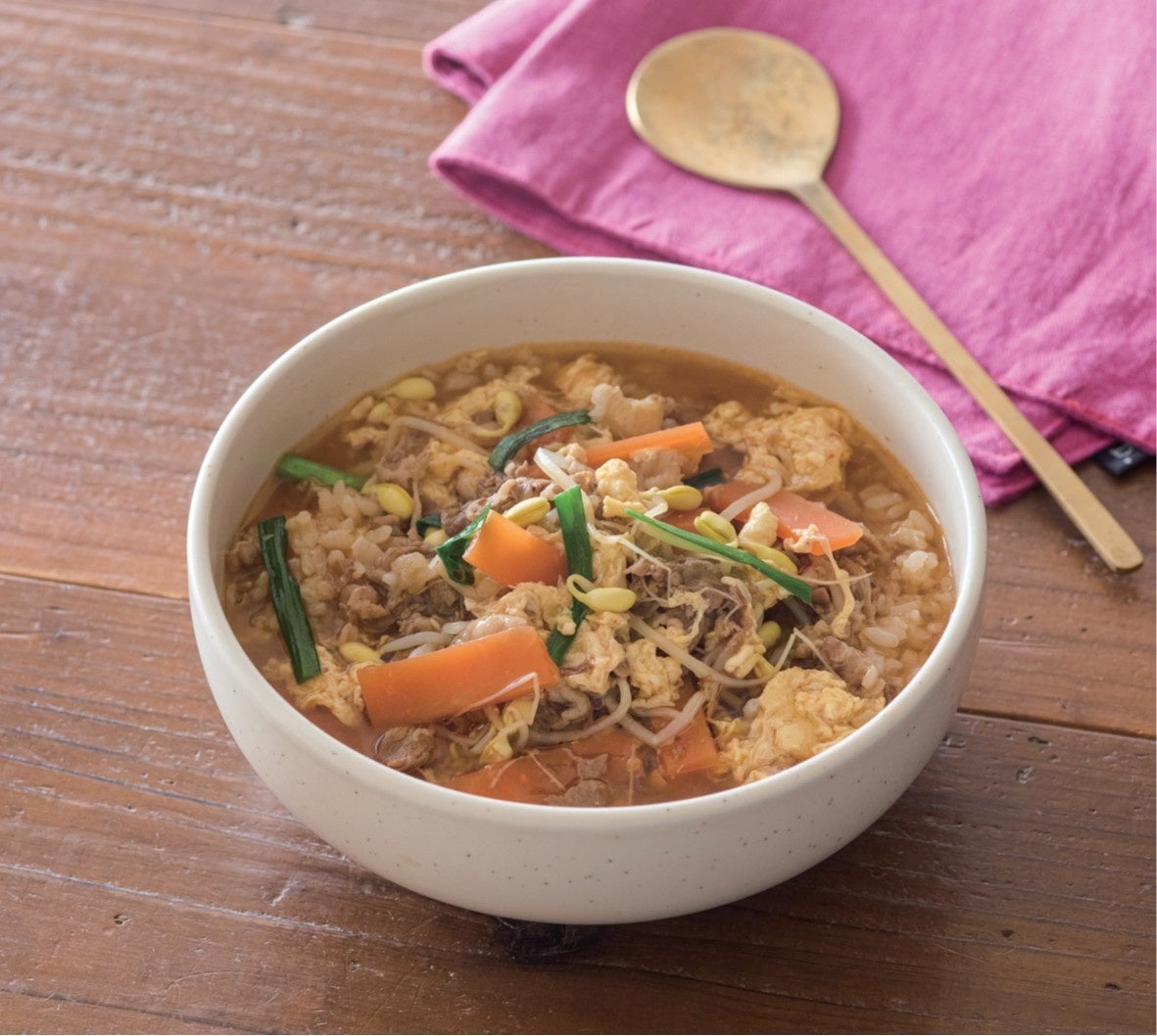 ②鍋にAを入れて中火にかける。沸騰したら豆もやしを加え、にんじんに火が通ったら牛丼の具とニラ、コチュジャンだれを加える。