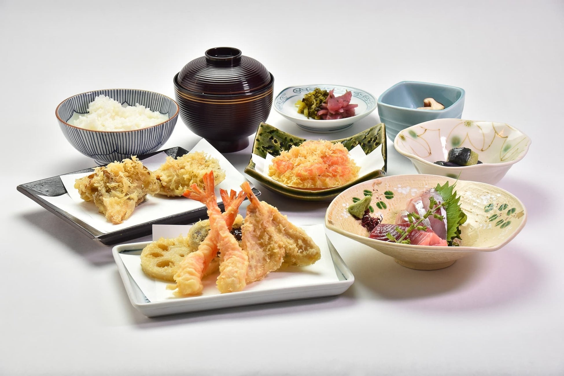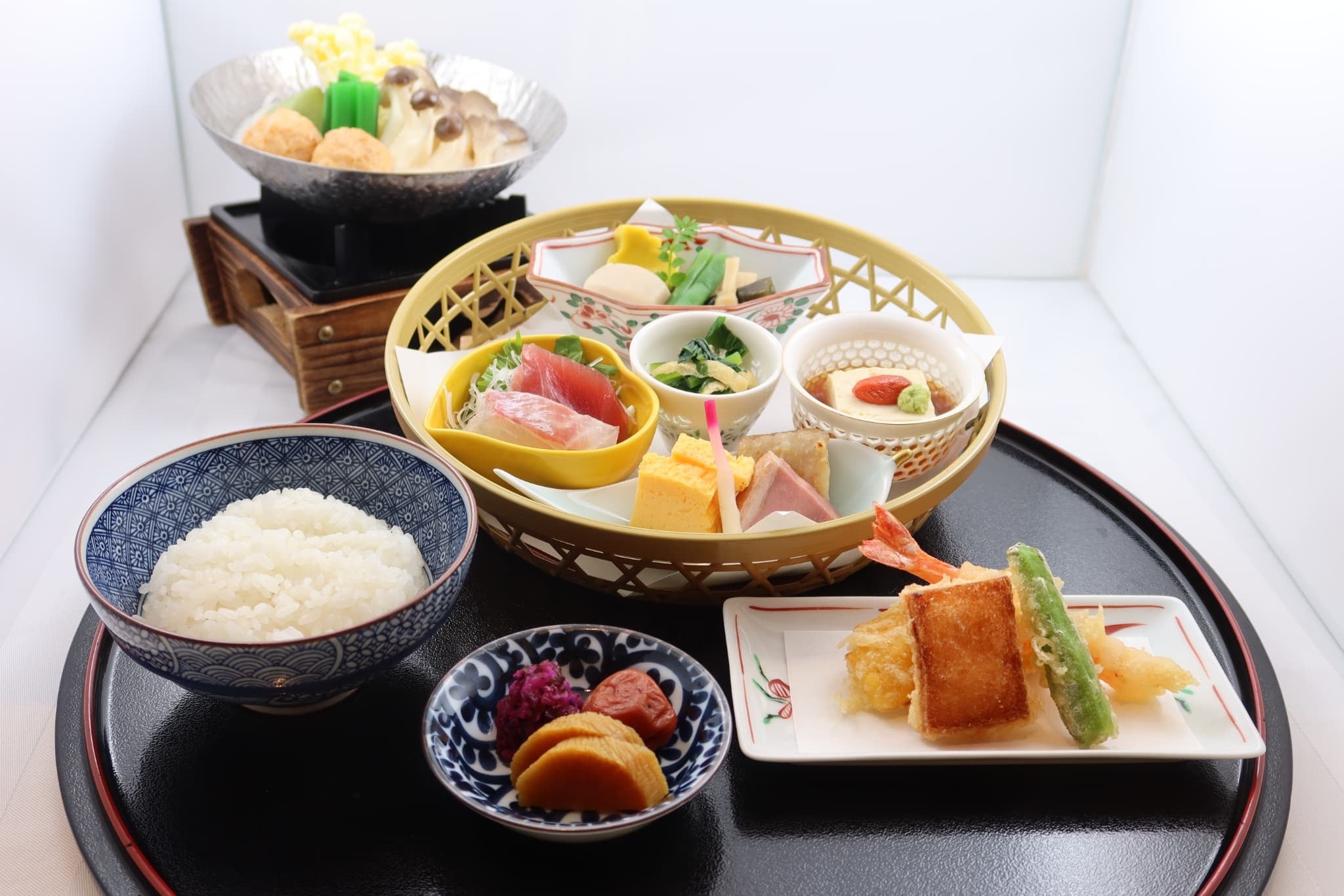 少しずつおばんざいのようなおかずと、人気の天ぷらに鍋もついたお得なランチセットです。