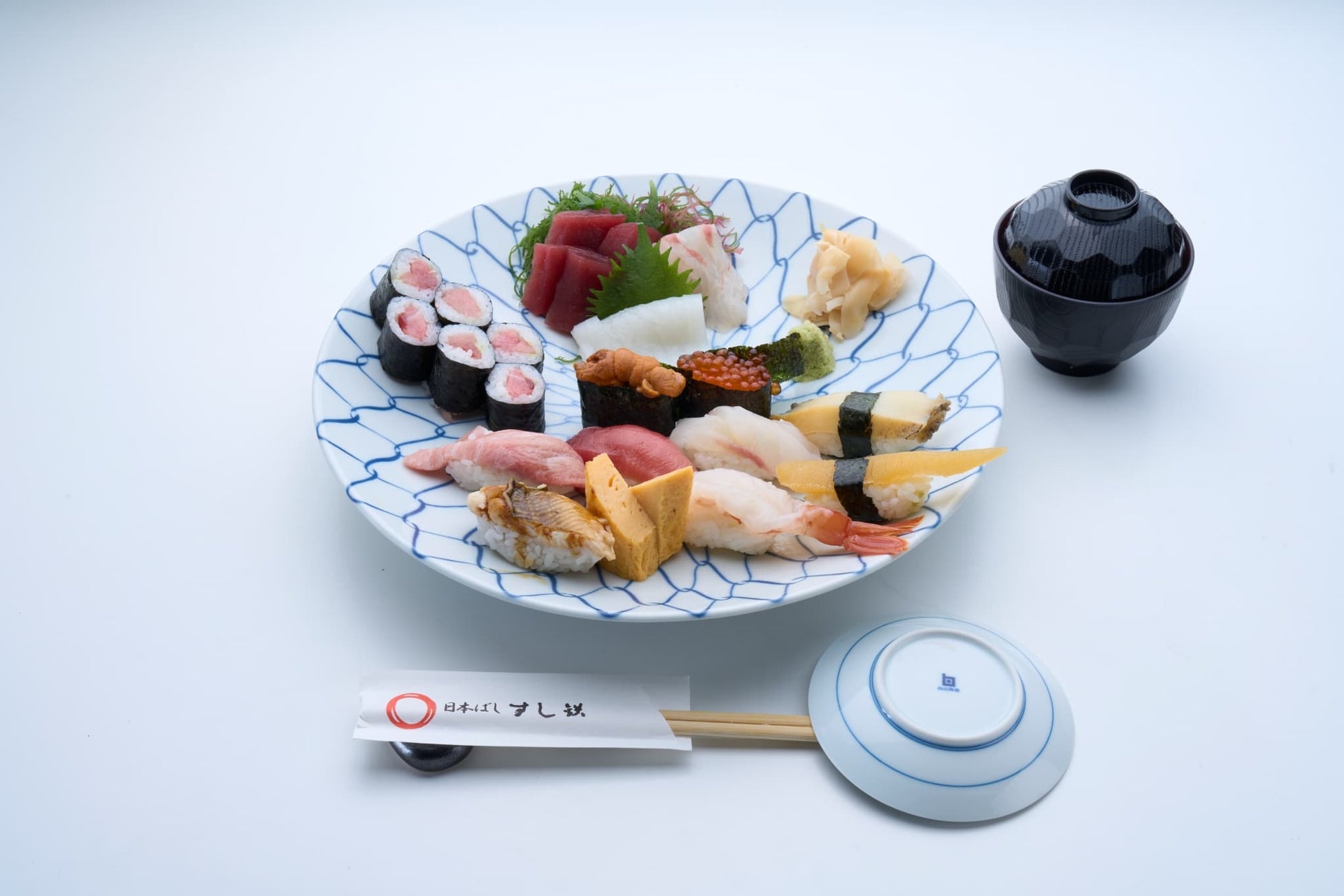 すし鉄人気の特選にぎりに赤身・白身・イカの刺身をプラス。お椀付き。