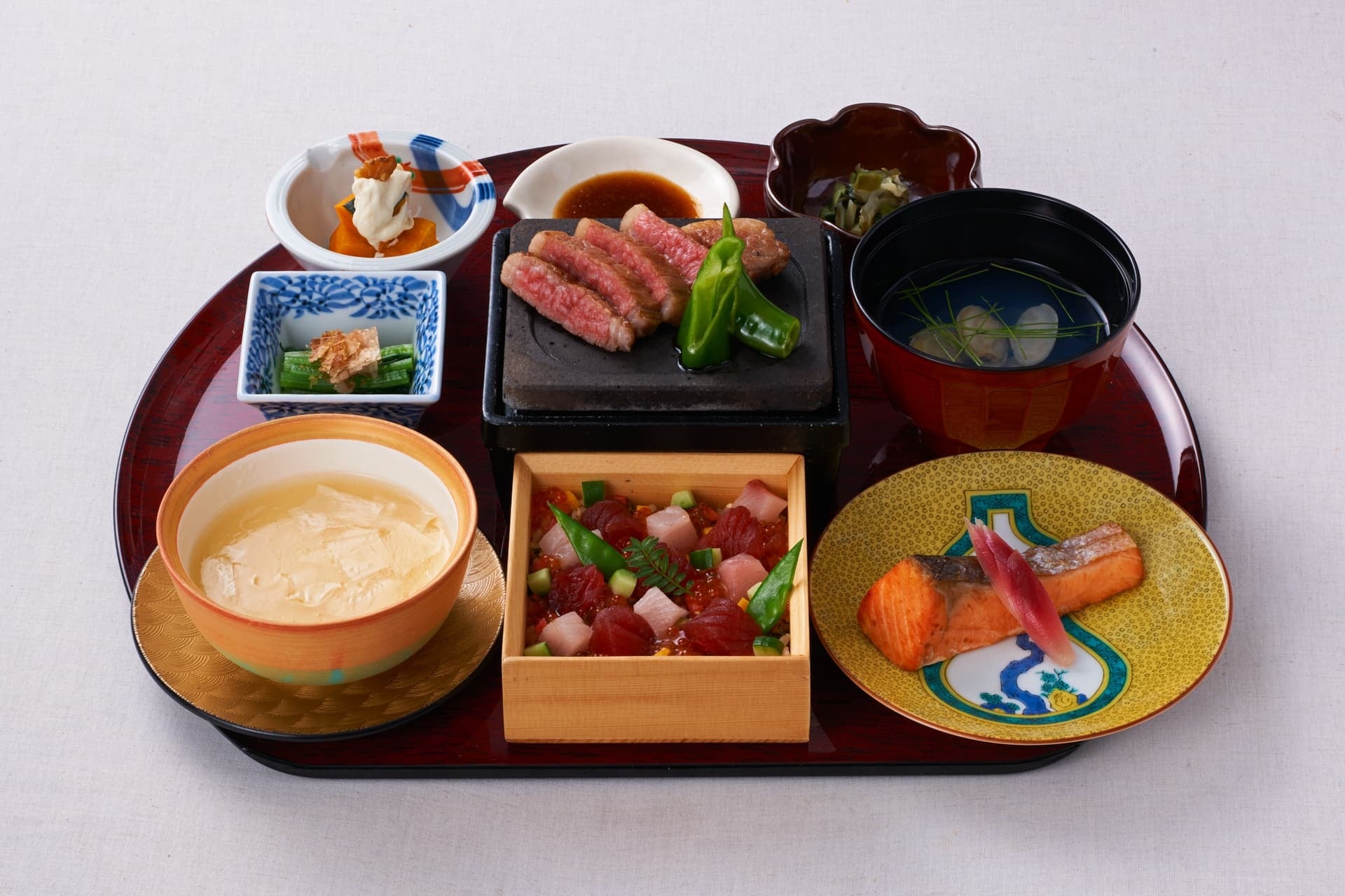 本鮪と色とりどりの具材を使った宝石箱のようなばらちらし。国産牛の石焼の2つのメインが楽しめる御膳です。