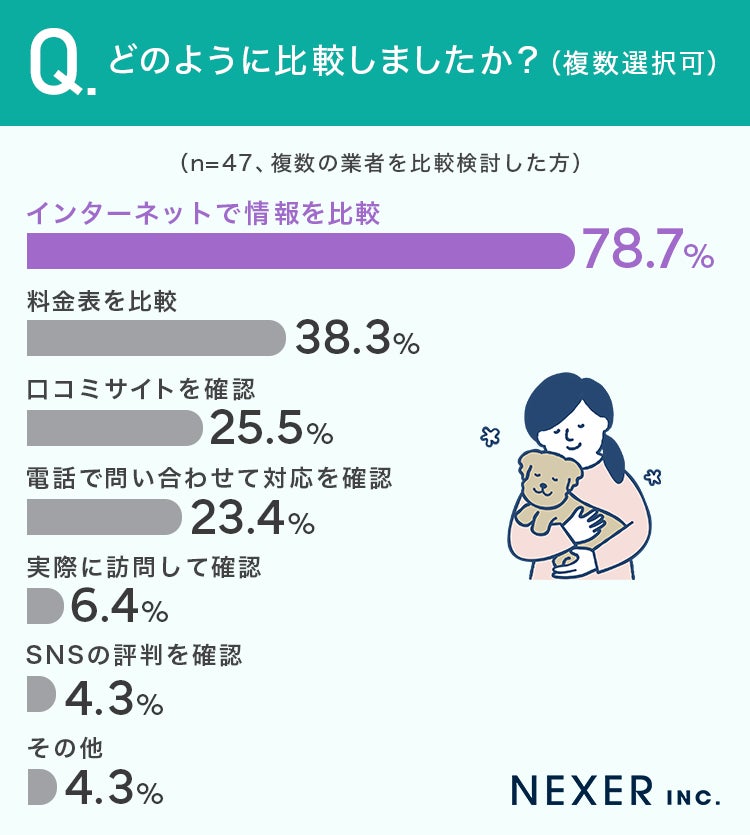 その結果「インターネットで情報を比較」が78.7%と最も多い結果になりました。次いで「料金表を比較」が38.3%、「口コミサイトを確認」が25.5%と続きます。