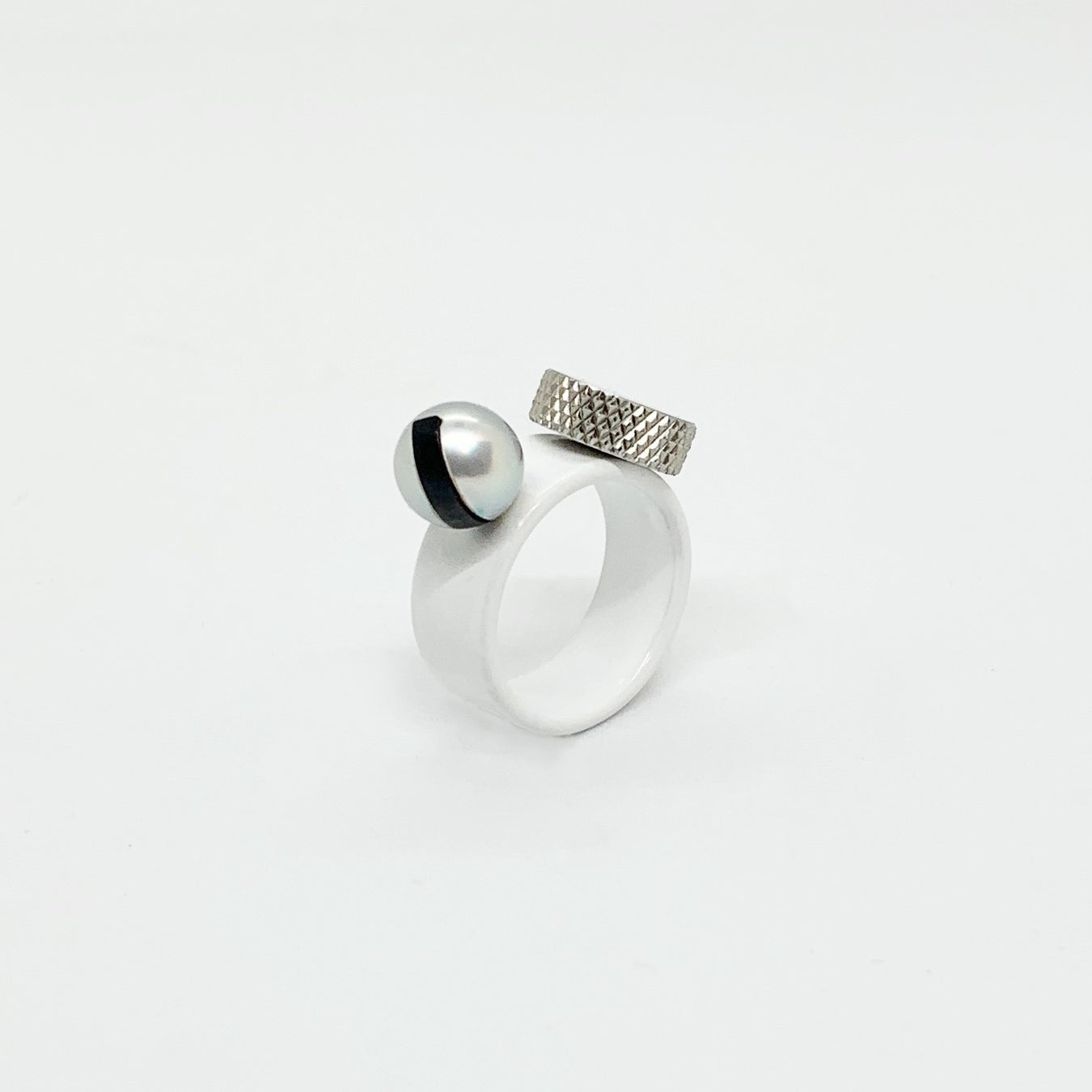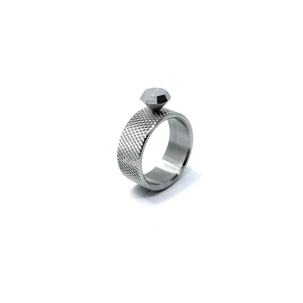 機械産業品向けに精密加工生産をする町工場が大田区には多数あることをヒントに、現代美術作家である田添かおりがアートジュエリーとして企画、デザイン。特徴は、リングのパーツと、ヘッドのパーツをネジ式によって組み立てるというもの。