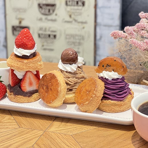 「スコーンサンド いちごあんホイップ」は、プレーンスコーンにいちごとホイップをサンドしました。北海道産つぶあんを土台に忍ばせ和洋折衷スイーツに仕上げました。「モンブランスコーンサンド 利平栗」は、茨城県産の栗の王様“利平”をたっぷり使用した高級モンブランをスコーンでサンドしました。濃厚な国産栗とクリームの感動するおいしい組み合わせです。「モンブランスコーンサンド 紅芋」は、濃厚な甘みとねっとりした食感が特長の沖縄県産紅芋を使いモンブランをスコーンでサンドしました。土台に忍ばせたさつまいも餡と上面に飾った大学芋がアクセントになっています。