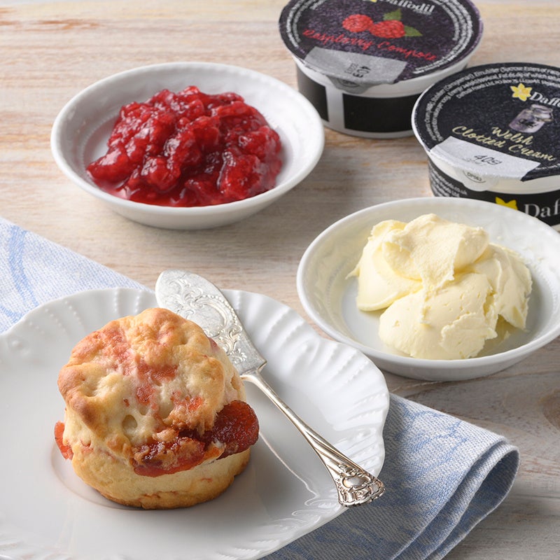 〈プリムローズ〉×〈ダフォディルフーズ〉スコーンとクロテッドクリームとジャムのクリームティーセット 1,566円(1セット)※100セット限り英国では、スコーン、クロテッドクリーム、ジャム、紅茶のティータイムのことを「クリームティー」と呼びま す。〈プリムローズ〉のいちごのバターミルクスコーンに〈ダフォディルフーズ〉のクロテッドクリームとラズベリージャムをセットにしました。