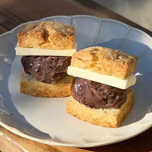 名古屋名物あんバターがスコーンサンドに。北海道産小豆を使用した自家製粒あんに北海道バターをサンドしました。仕上げにゲランドの塩をアクセントに。ほどよい塩味と甘さのバランスが 絶妙な組み合わせです。バターがじわっと溶けるまで軽く温めても美味しくお召し上がりいただけます。