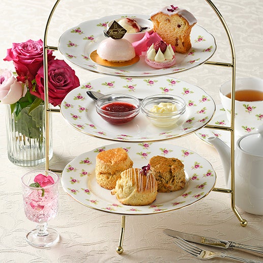 新春の〈スリーティアーズ〉スイーツセットは、「バラ」がテーマ。スコーンは5cmサイズのローズスコーン、ダブルバター、ミルクティーの3種類。最上段のスイーツは、ロゼのムース、ローズパウンド、ローズマカロン、ローズジャムソースをかけたバニラアイス。そしてローズコーディアルのゼリーをグラスで。ウェルカムティはロイヤルウェディングティーを。ポットティーは、スイーツに合わせたオリジナルブレンドです。