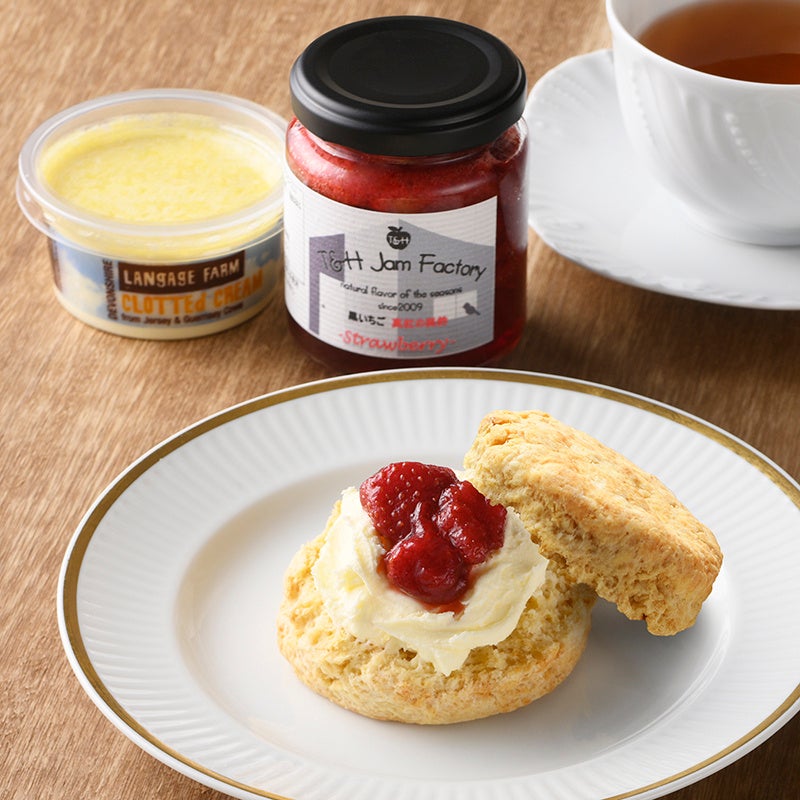 スコーン+クロテッドクリーム+いちごジャムの王道の組み合わせ。本場英国のスコーンとクロテッドクリーム、そこに色鮮やかないちごジャムを組み合わせました。