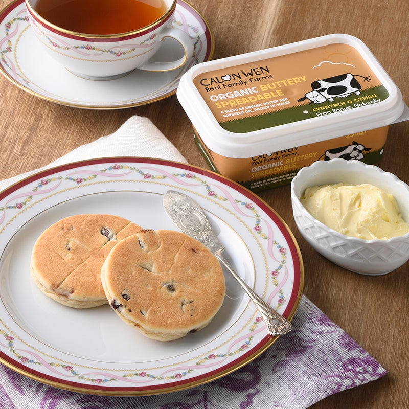 ウェルシュケーキは英国ウェールズの伝統菓子です。中はしっとりほくほく、外側はサクサクしたパンケーキ、スコーン、ショートブレッドの食感を併せ持つ独特な優しい甘さのお茶菓子。現地では、温めたウェルシュケーキに有塩バターを塗って食べるのが一般的。農薬を使わない牧草のみを食べてのびのび育った牛の生乳を使って作ったオーガニックの有塩スプレタブルバターは滑らかでミルキーな味わいです。