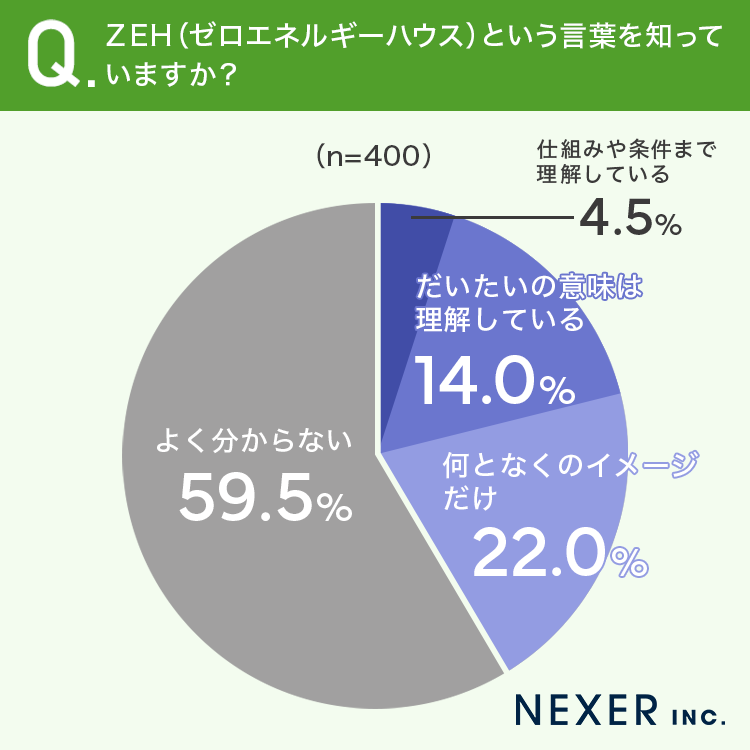 ということで今回はながでんハウスと共同で、事前調査で「現在持ち家の一戸建てに住んでいる」と回答した全国の男女400名を対象に「住宅の省エネ性能・ZEH」についてのアンケートをおこないました。