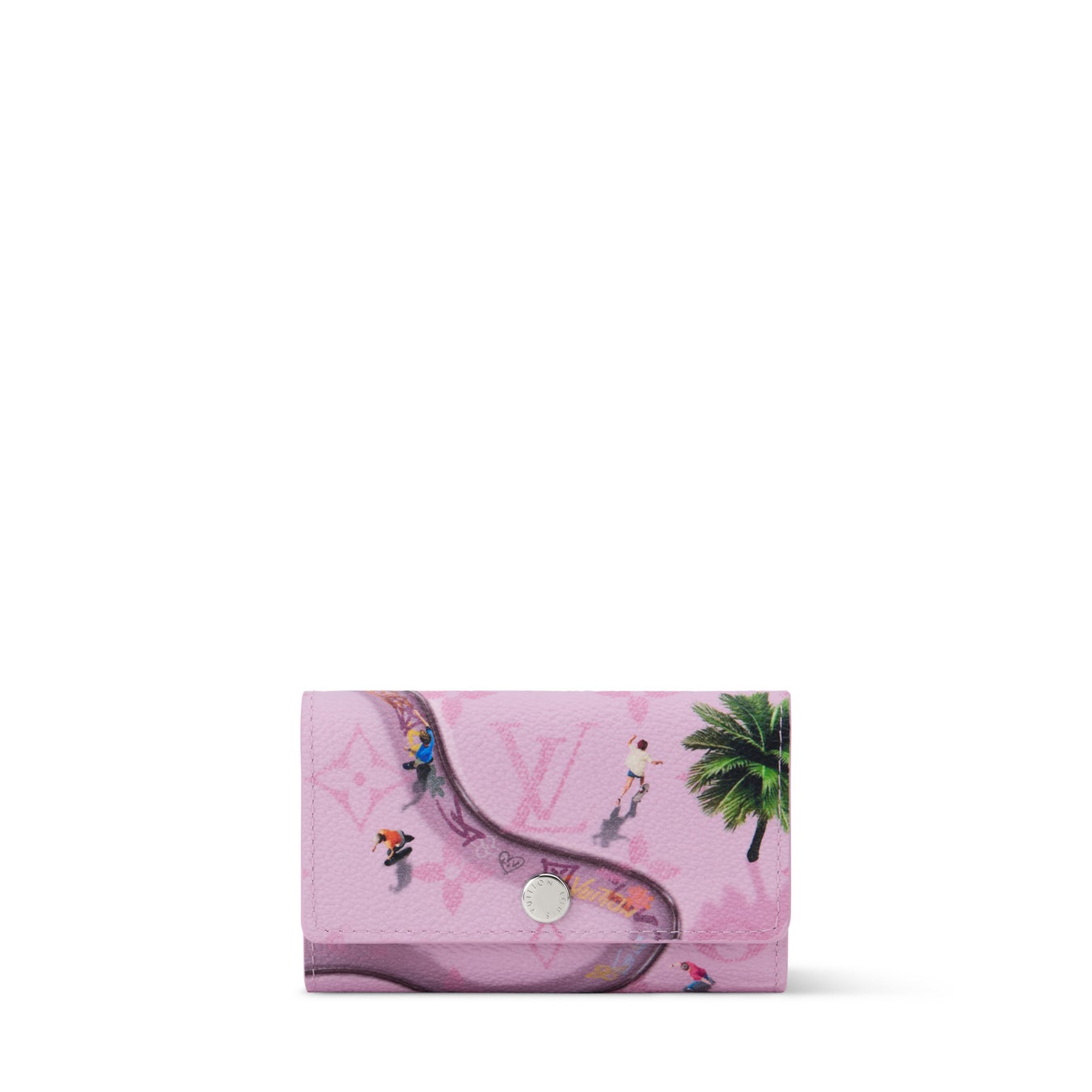 軽量なモノグラム·キャンバスを背景に、夕暮れ時のスケートボード場でスケートボードを楽しむ小さなスケーターたちをあしらった、実用性に優れたキーケース「ミュルティクレ 6」。内装には「Louis Vuitton」の刻印が施されたシルバーカラーのメタルパーツに付いた6つのキーリングで鍵をしっかり収納できます。