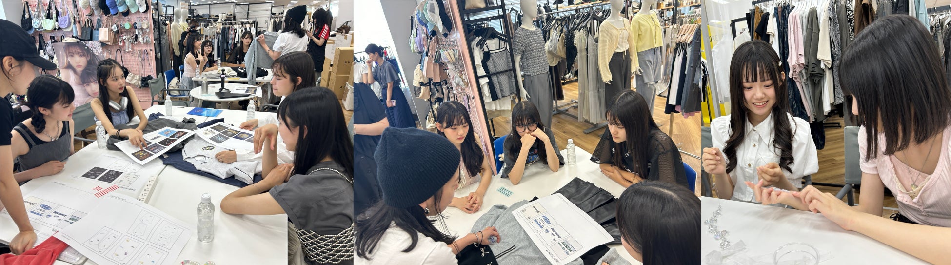 今回は3グループに分かれて商品企画会議を実施。商品一つひとつに対して、「ガーリーなイメージの子だったら、ゆるっとしたシルエットが着やすそう!」「ダメージ加工はソデと裾なら、挑戦しやすいかも!」「ハーフZIPアップと短タケのトップスが欲しい!1枚で着ても、寒くないようにしたいです。」など、デザインやカラーに関して細かな意見する姿は真剣そのもの。