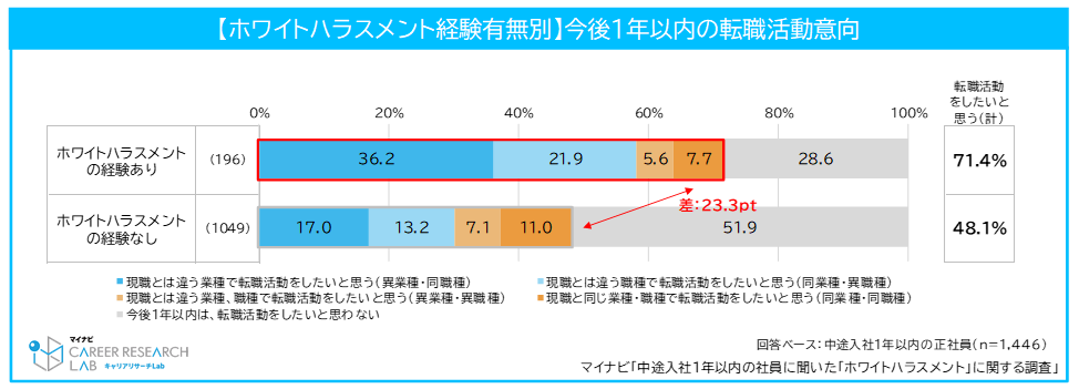 ◆「ホワイトハラスメント」経験者のうち、今後1年以内に転職したいと思う割合は71.4%。未経験者よりも23.3pt高い