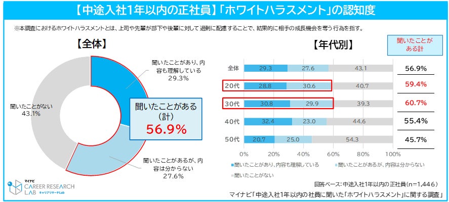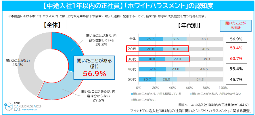 中途入社1年以内に中途入社した正社員のうち、「ホワイトハラスメント」という言葉を聞いたことがある割合は56.9%で、半数を超えた。