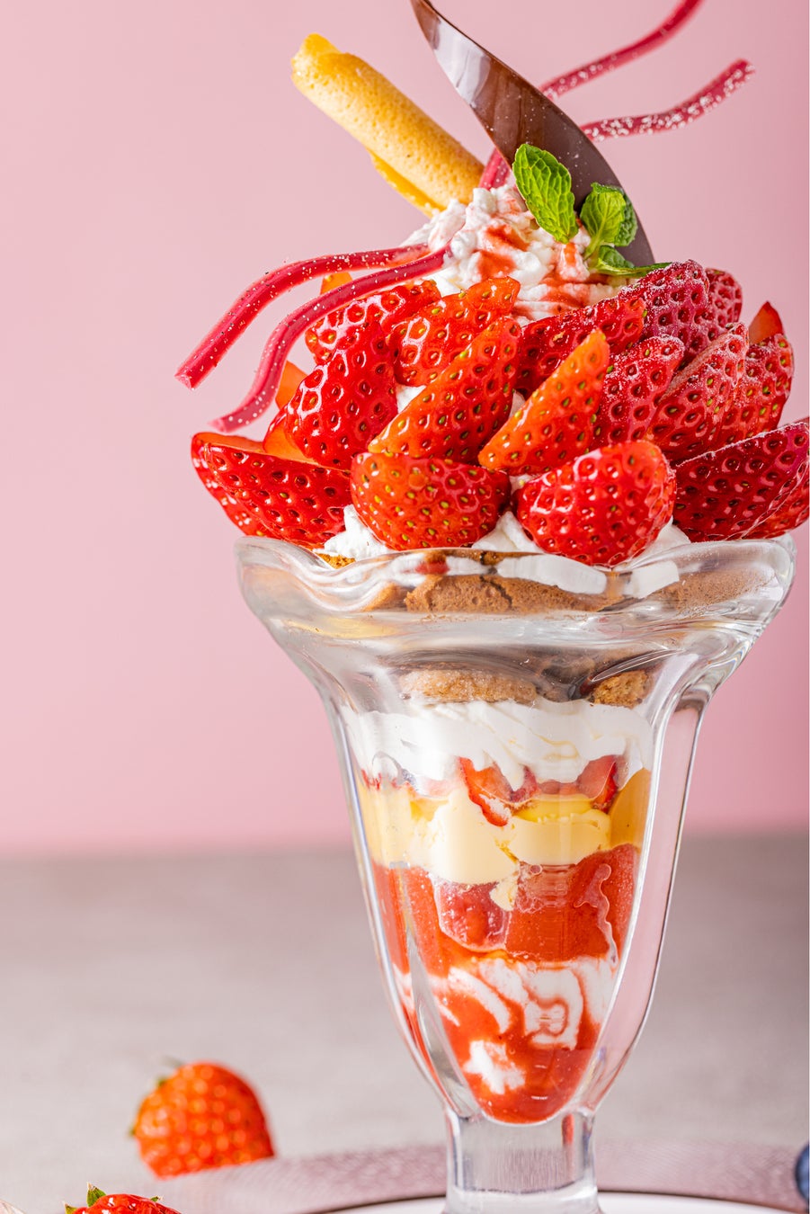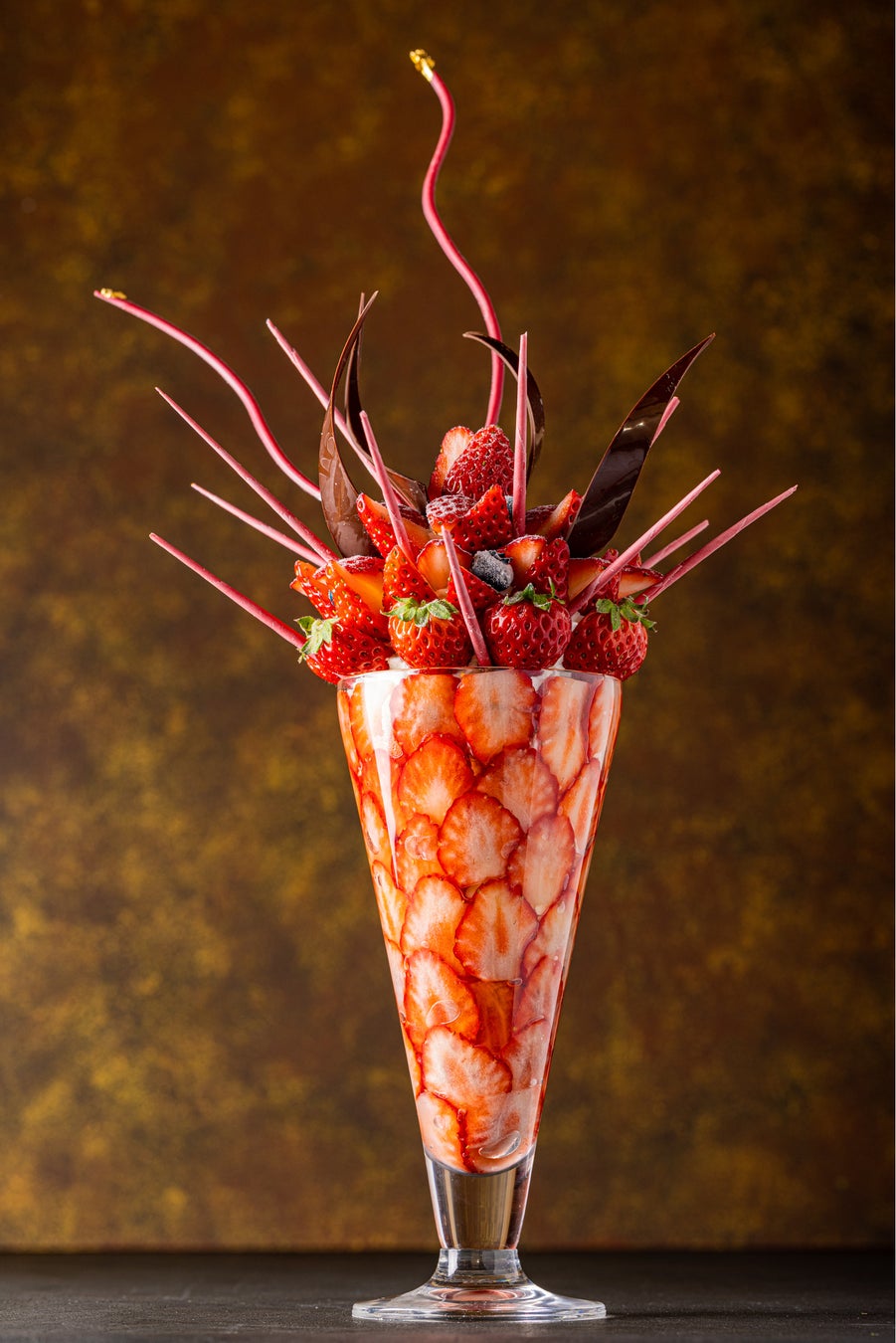 さざ波のように苺スライスを側面に敷き詰め、グラスから溢れんばかりの苺とブルーベリー、ルビーチョコがサンゴを模しています。