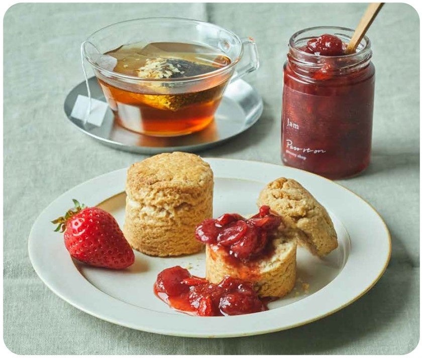 左)5年前にうきは市へ移住した塚本夫妻が作る自家製スコーンは、全粒粉と有機豆乳、ココナッツオイルを使用し、卵・バターは不使用。ジャムには大粒の“あまおう”と、香り高い小粒の“やよいひめ”、そしてクコの実を煮詰めて。