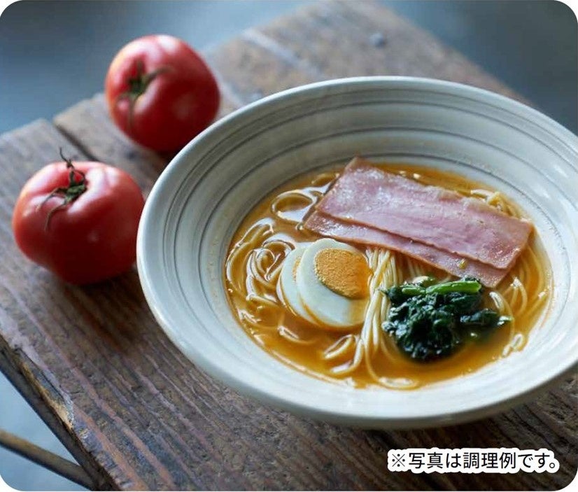 『地元産とまと“桃太郎”はおいしいが流通しない規格外品もある』と農協から相談を受けた小林稔男代表。試作と試食を繰り返しできたのがこの“とまとラーメン”。福岡県産「ラー麦」を使用したコシのある麺に絡むスープは、“桃太郎”ならではの酸味とコクが絶品!