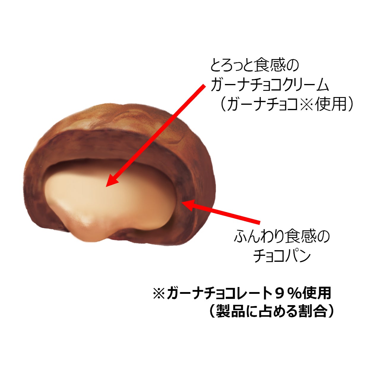 パンにもクリームにもガーナチョコを使用しました。中身のチョコクリームはとろっと柔らかく、パンはふんわり食感が楽しめます。