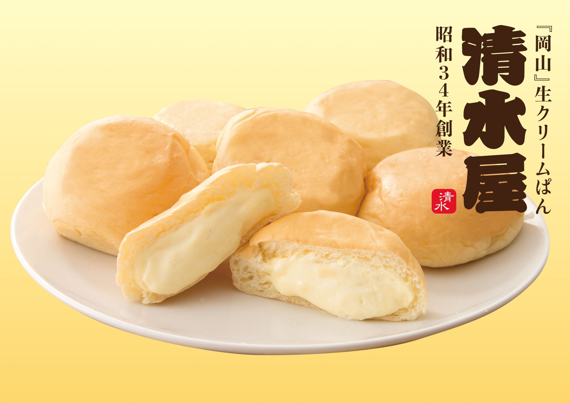 創業昭和34年 岡山市の老舗のパン店・株式会社清水屋食品は、幅広い世代に喜ばれる昔ながらの菓子パン「クリームパン」を、新しい食感のスイーツパンに進化させ、全国のパン好きの方へお届けし続けています。厳選した素材と職人の丁寧な仕事が織りなす絶品パンを作り出すクリームパン専門店です。