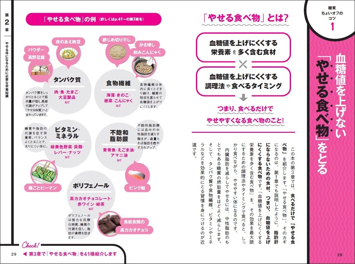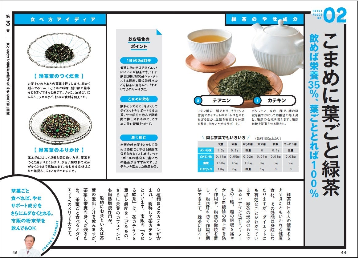 「食前・食間の高カカオチョコ5g」や「葉ごと緑茶」「ホットでヨーグルト」など「やせたい、でも食べたい」をかなえる『やせる食べ物』とレシピアイディアが満載