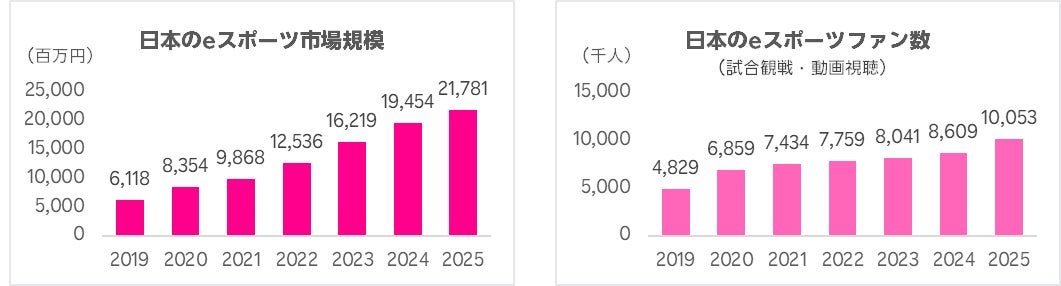 日本のeスポーツ市場は年平均20%を超える成長率で急速に拡大しており、2025年には市場規模200億円を超えることが見込まれています。ファン数も増加の一途をたどり、2025年には1,000万人を突破する見込みです(注1)。高校生のeスポーツへの関心も高く、高校対抗の全国eスポーツ大会「STAGE:0」には過去最多の7,692名が参加(注2)。2025年の大阪・関西万博での開催も予定されており、市場の成長とともに、さらなる盛り上がりが期待されます(注2)。