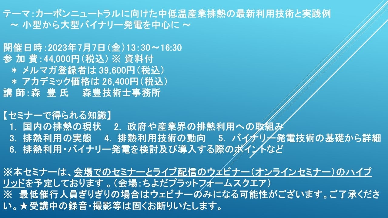 【会場/ZOOMハイブリッドセミナー】カーボンニュートラルに向けた中低温産業排熱の最新利用技術と実践例~ 小型から大型バイナリー発電を中心に ~ 7月7日(金)開催 主催:(株)シーエムシー・リサーチ