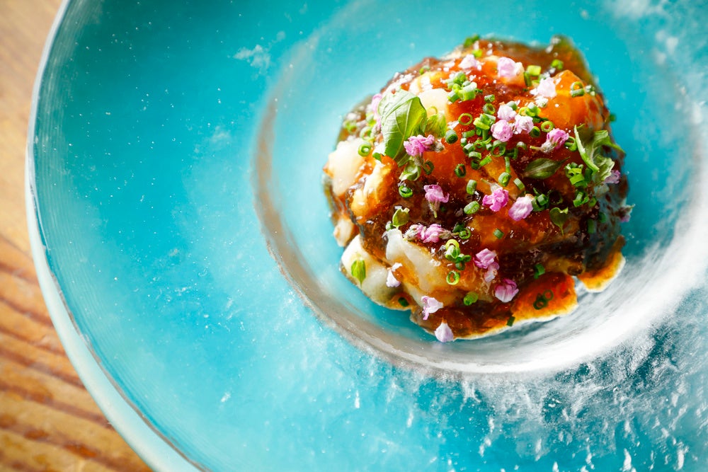 創作料理の「とらふぐのタルタル」は見た目にも美しい。イタリア料理との融合を目指し、試行錯誤を繰り返した。