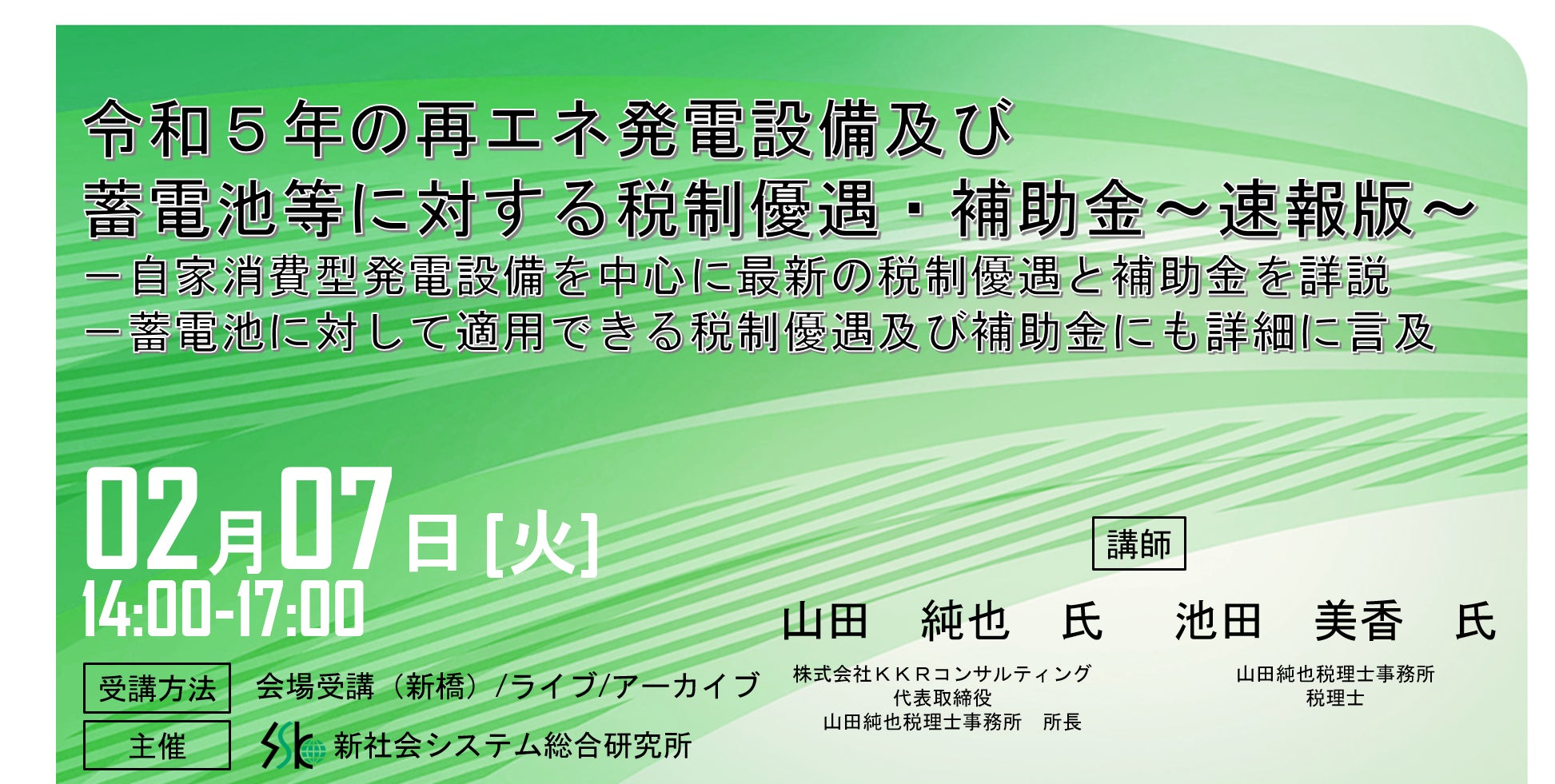 「令和5年再エネと蓄電池の税制補助金~速報版~」と題して山田純也税理士事務所 所長 税理士 山田 純也氏、税理士 池田 美香氏のセミナーを2月7日(火)に開催!!