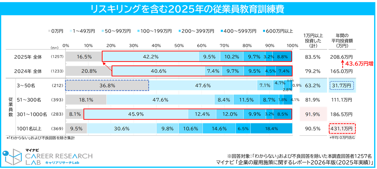 従業員への教育投資状況について聞くと、2025年にリスキリングを含む従業員の教育訓練費に「1万円以上投資した(計)」企業は83.5%と、前年(79.2%)より4.3pt増え8割を超えた。