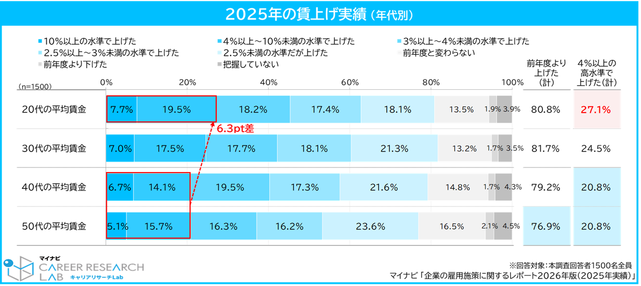 「40代・50代」は各20.8%にとどまり、「20代」との差は6.3ptとなった。賃上げ自体の実施率には年代差が少ない一方、賃上げの水準で見ると、若い年代ほど“高水準”である傾向がみられた。