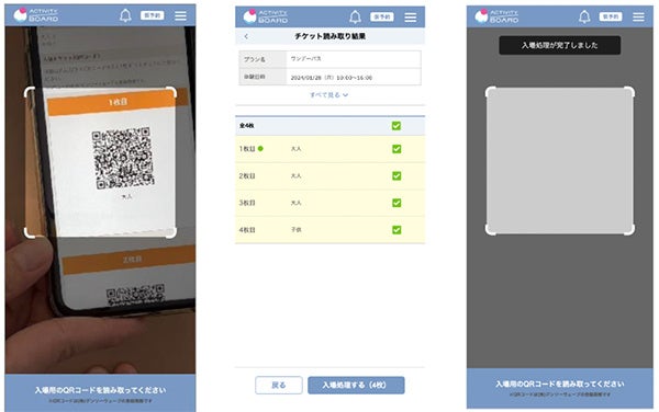 ▼施設側の入場チケット読み取り画面、読み取り結果画面