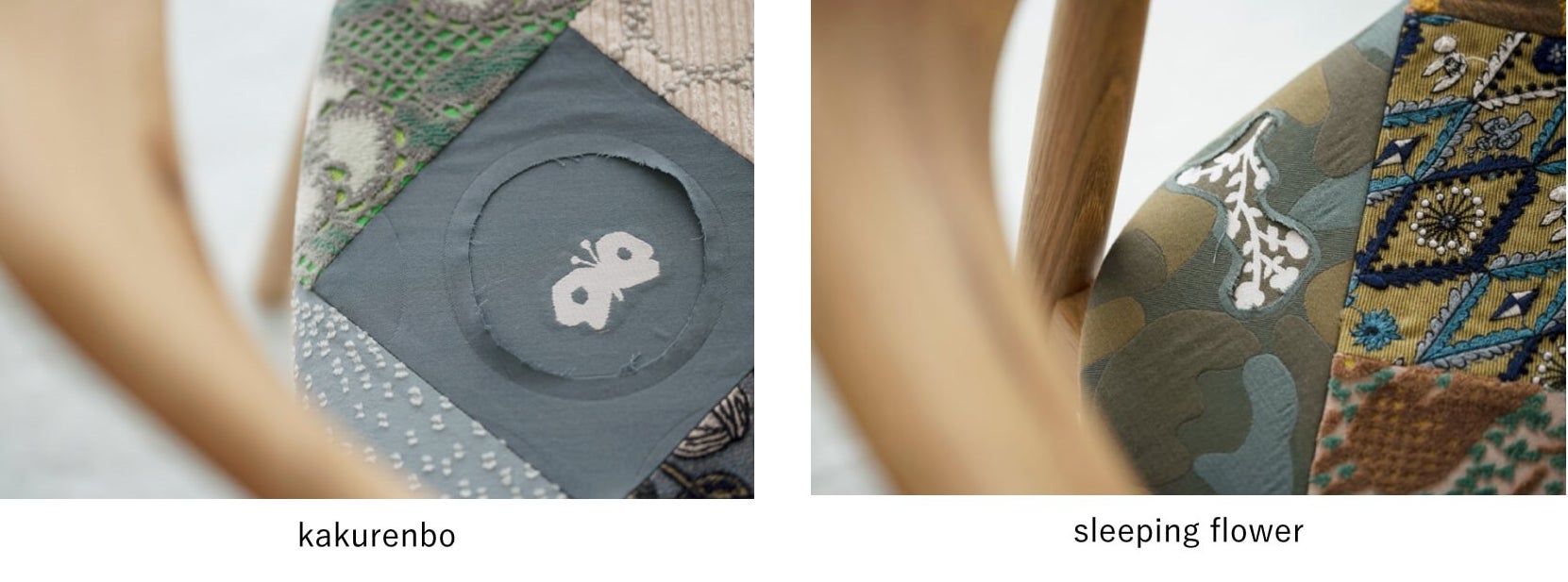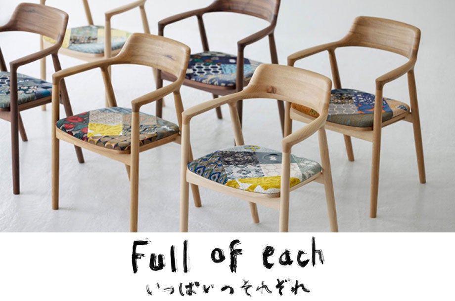 <マルニ木工>と<minä perhonen>デザイナーの皆川 明氏が、資源活用を考え、はじかれていた個性的な木目を素材が持つ本来の美しさととらえ、愛ある視線で市場に送り出す「ふしとカケラ」企画。「ふし」のあるチェアフレームを個性ととらえ、製品とするために、裁断した際にハギレとなった<ミナ ペルホネン>のファブリック「カケラ」を組み合わせ、多様化した個性を表現します。