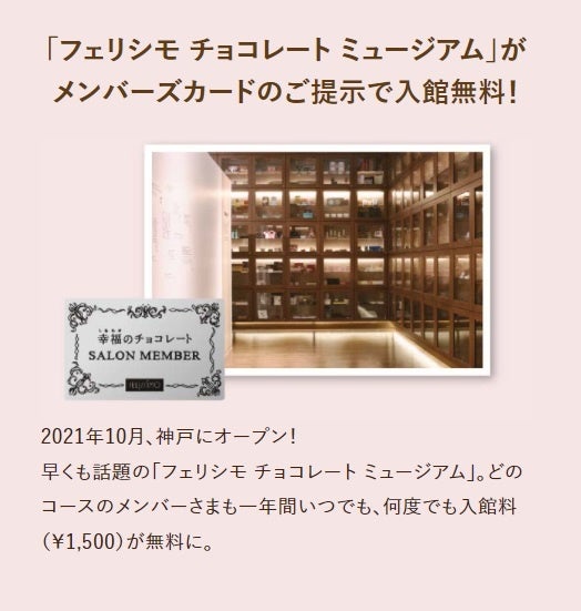 2021年10月、神戸にオープンした「フェリシモ チョコレート ミュージアム」。どのコースのメンバーさまも一年間いつでも、何度でも入館料(¥1,500)が無料に。