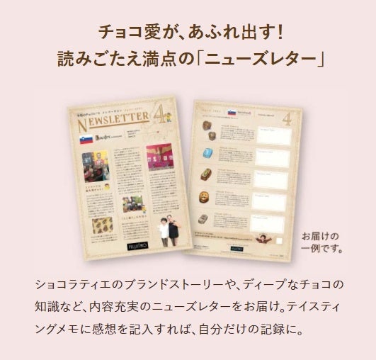 チョコをバレンタインデイやホワイトデイといった大切な人へ贈る特別な日の催事用ギフトとしてはもちろん、気温に左右されず、手放しでチョコを楽しめるハッピーな“チョコレートのシーズン(旬)”という位置付けで、お届け便を設定。2月の「バレンタイン便」、3月の「ホワイトデイ便」の2回のお届け便で購入できます。