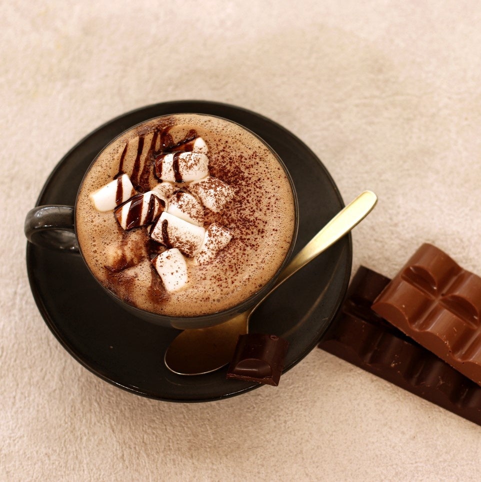 オーツミルクにデーツシロップの優しい甘さとヘーゼルナッツの香りが広がる大人のホットチョコレートです。ホットチョコレートの上で溶けてゆく、とろふわのマシュマロをお楽しみください。