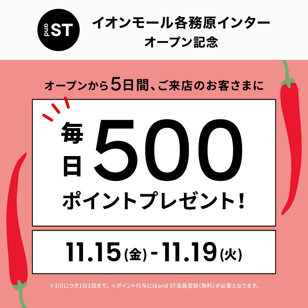 2024年11月15日(金)~2024年11月19日(火)の5日間、店頭に設置している来店ポイント端末に and ST会員バーコードをかざすだけで来店ポイントがもらえます。上記期間は、オープンを記念して毎日500ポイントをプレゼントいたします。