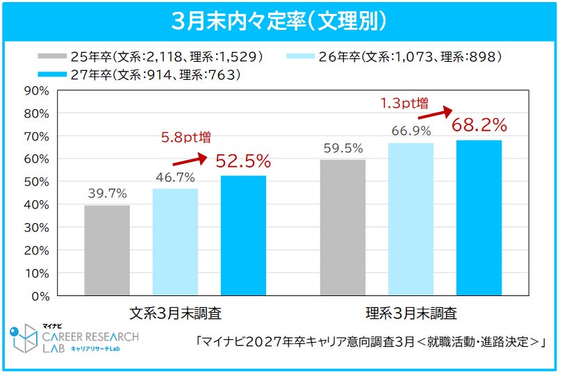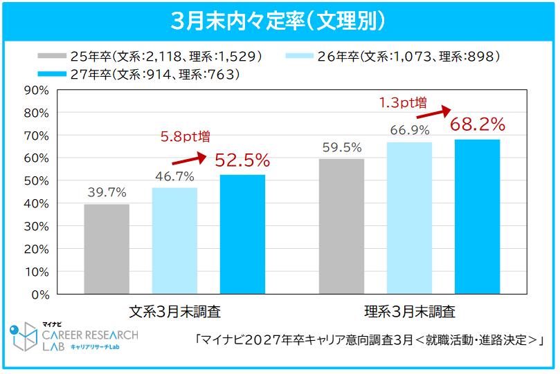 2027年卒学生の3月末の内々定保有率は、前年同月から4.1pt増加し、58.7%だった。3月1日調査時点では46.0%で、約1カ月で12.7pt増となった。文理別で見ると、文系学生は52.5%(前年同月比5.8pt増)、理系学生は68.2%(前年同月比1.3pt増)と、理系学生の方が高いが、前年同月比の上り幅は、文系学生の方が理系学生よりも大きい。【図1、2】