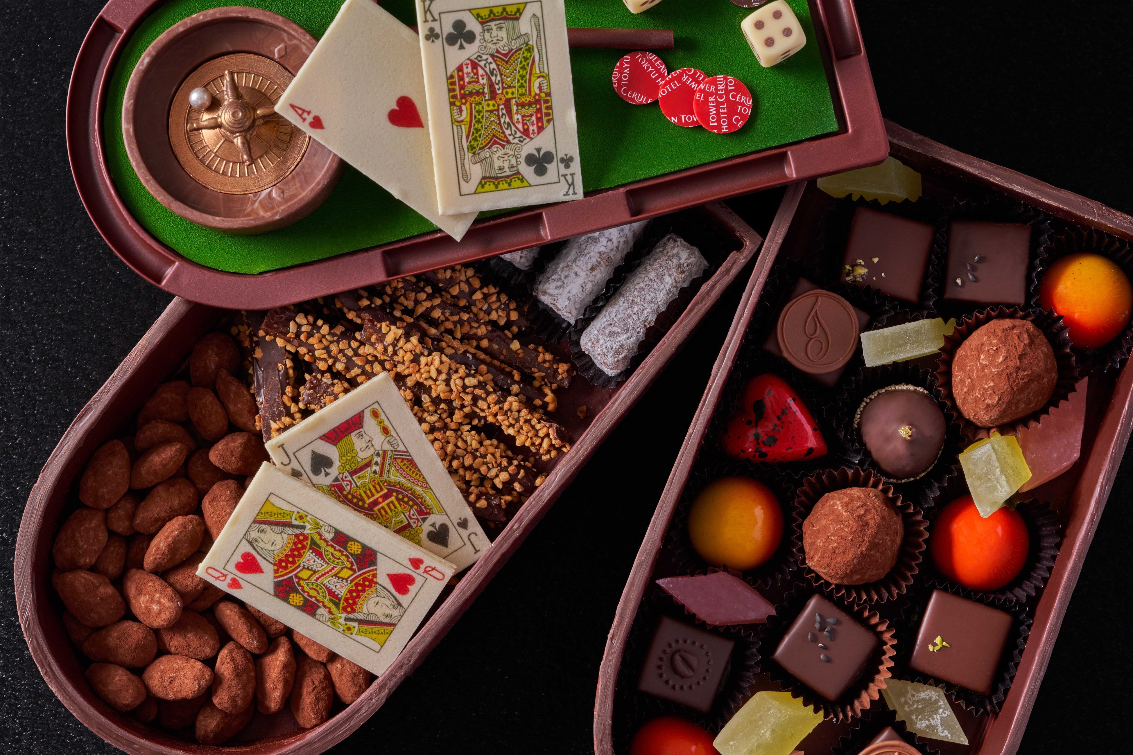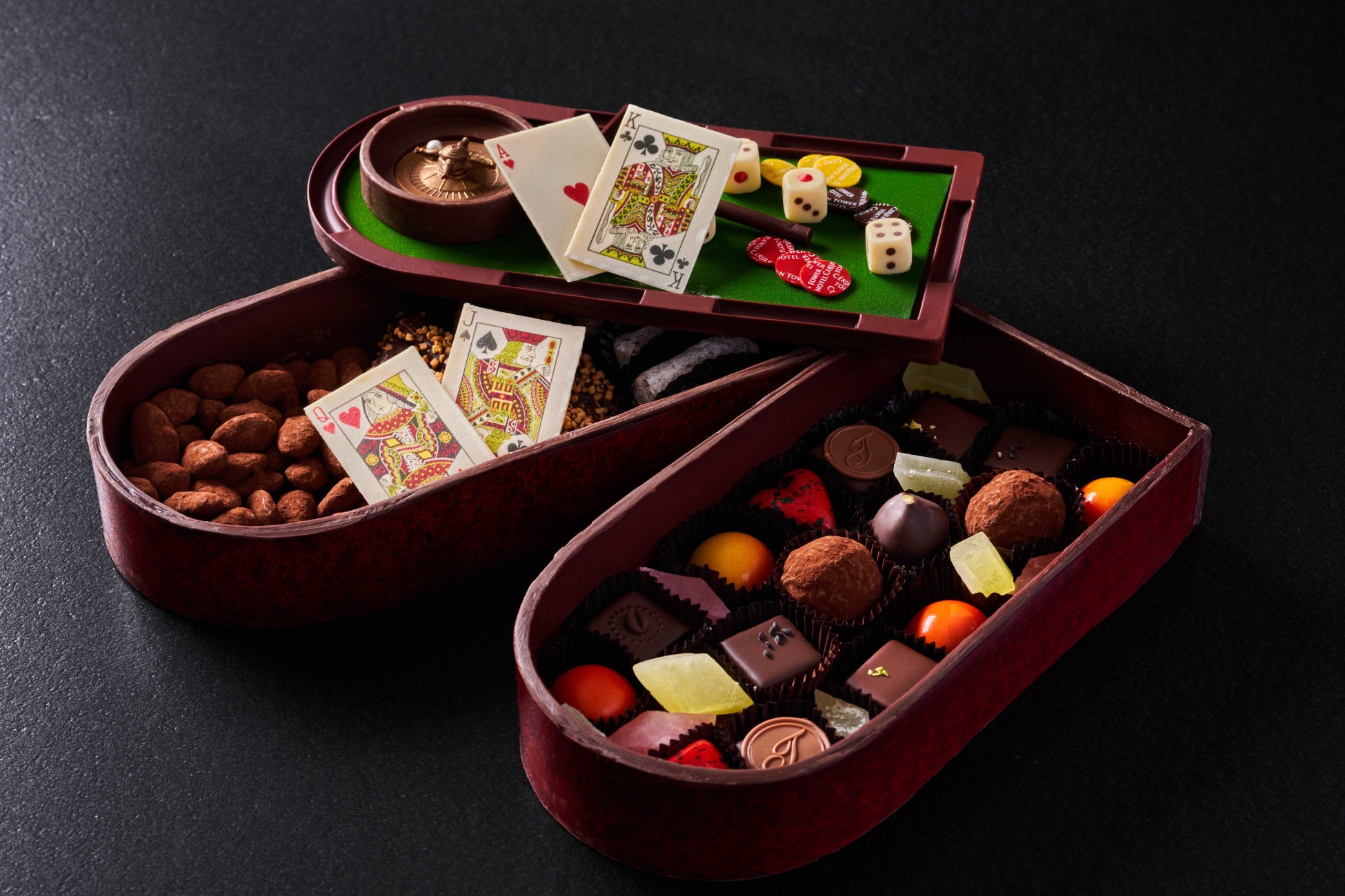 「CASINO 2022~運命のいたずら~」は2013年の販売開始以来、予約受付開始後30分以内に完売する年が数年続くほどご好評をいただいている人気商品です。ルーレット、ディーラースティック、ダイスからカジノテーブルを表現したボックスに至るまで、全てをチョコレートで精巧に作り上げています。本年は、チョコレートボックスが2段になり、宝石をイメージした琥珀糖を追加して、さらに贅沢な仕様となりました。