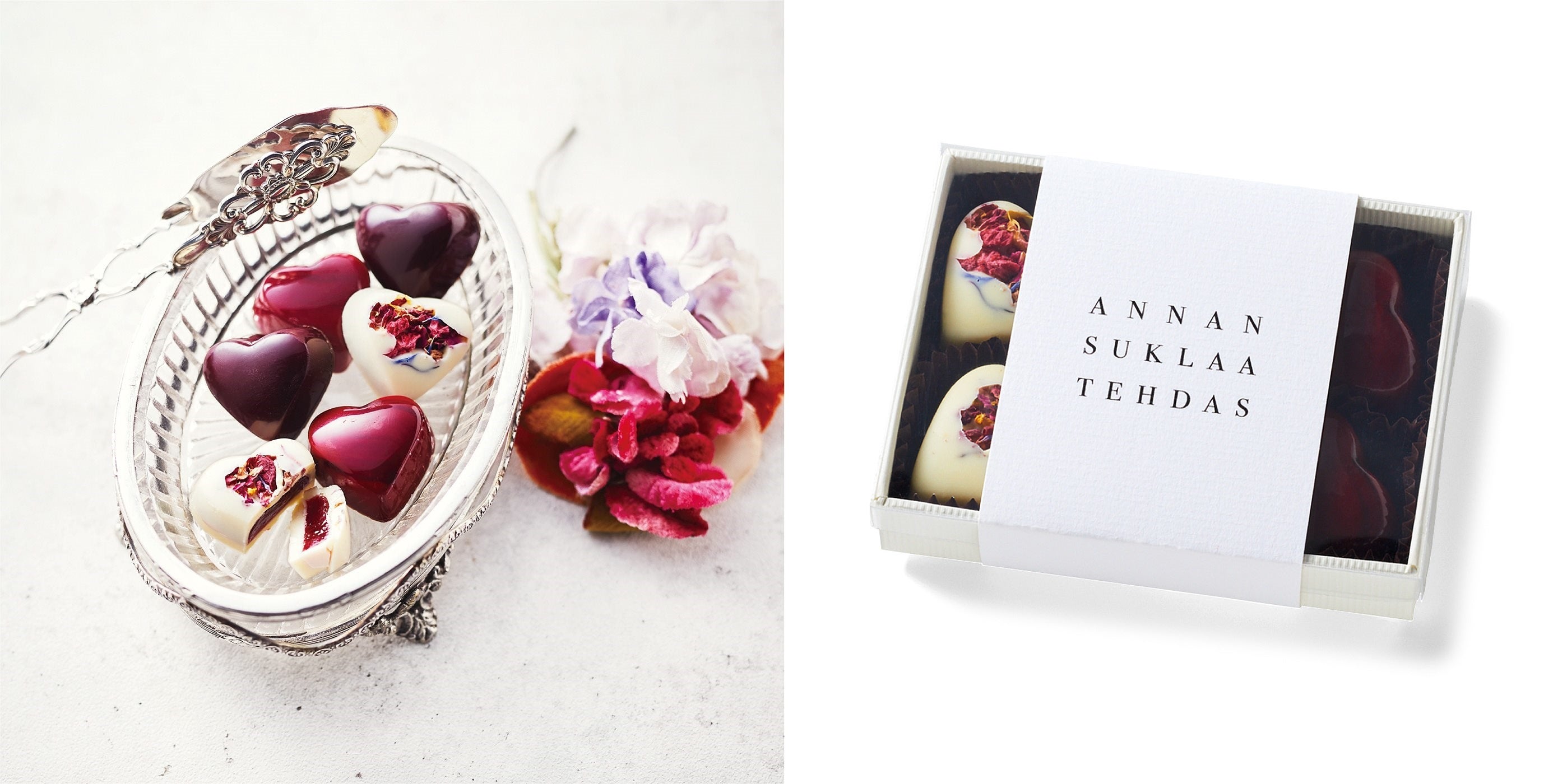 ヘルシンキの女性ショコラティエ、アンナさんから、ホリデーシーズンをイメージした麗しいスペシャルボックスが到着。3色のハートチョコの中には、酸味のきいたブラックカラント、シナモンキャラメル、ラズベリーが。3種3様のおいしさを贅沢(ぜいたく)に楽しめます。
