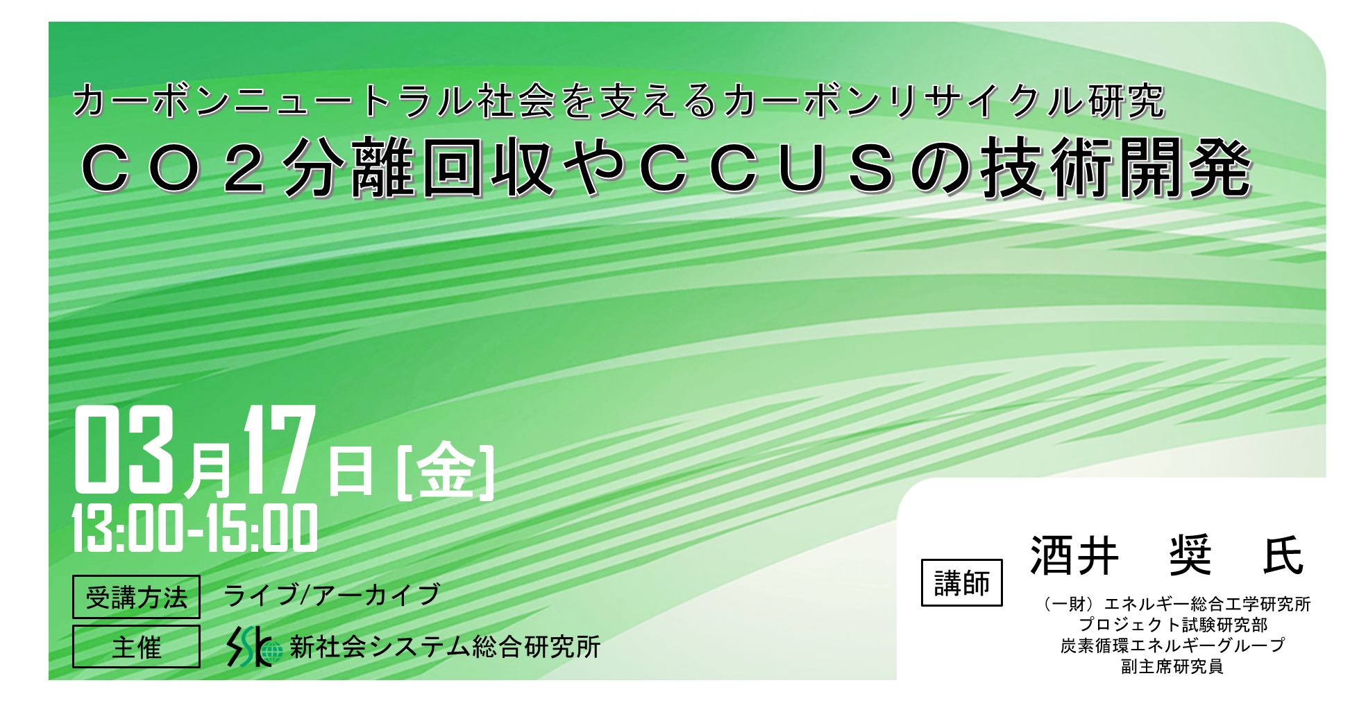 「CO2分離回収やCCUSの技術開発」と題して(一財)エネルギー総合工学研究所 プロジェクト試験研究部 酒井 奨氏のセミナーを3月17日(金)に開催!!