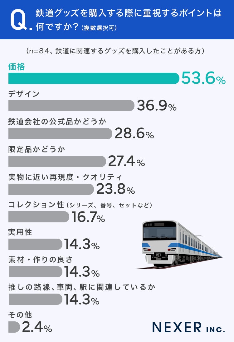 最も多かったのは「価格」で53.6%でした。次いで「デザイン」が36.9%、「鉄道会社の公式品かどうか」が28.6%、「限定品かどうか」が27.4%、「実物に近い再現度・クオリティ」が23.8%と続きます。