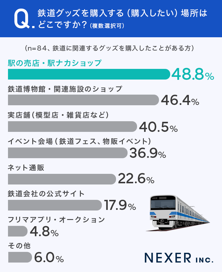 最も多かったのは「駅の売店・駅ナカショップ」で48.8%でした。次いで「鉄道博物館・関連施設のショップ」が46.4%、「実店舗(模型店・雑貨店など)」が40.5%、「イベント会場(鉄道フェス、物販イベント)」が36.9%と続きます。