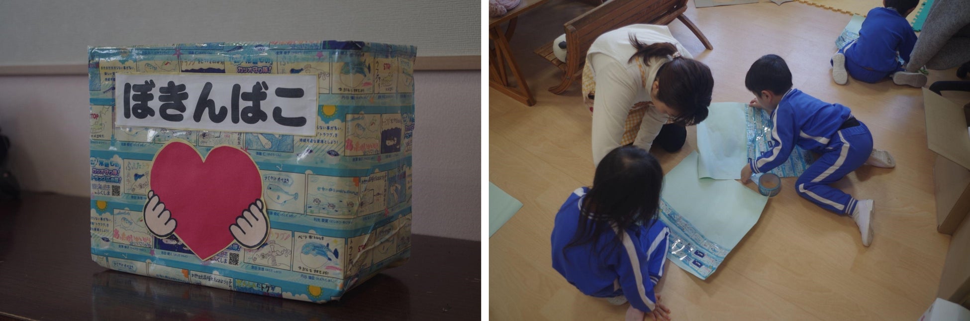 「持続可能な資源」をテーマにしたテープで、幼稚園の募金箱が完成