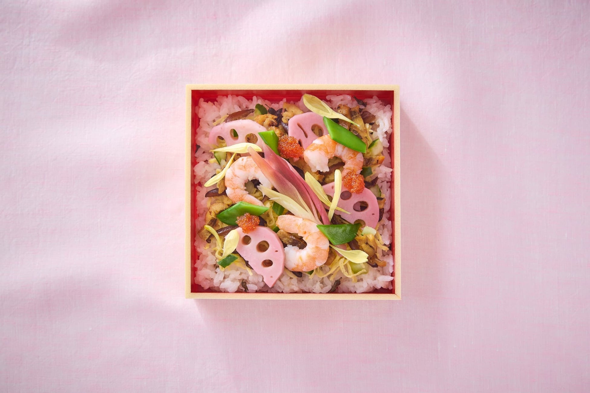 桃の節句を彩る、菱形の華やかな二段重。彩り豊かなちらし寿司に京都の菜の花や筍などの旬野菜、桜香る道明寺を添え、ひな祭りのひとときを演出します。
