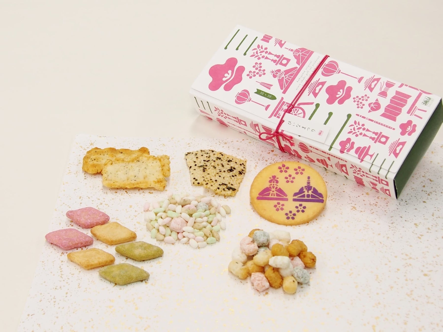 桜葉や貝だしを使用したおかきと、ひなあられも入った可愛らしい詰合せ。