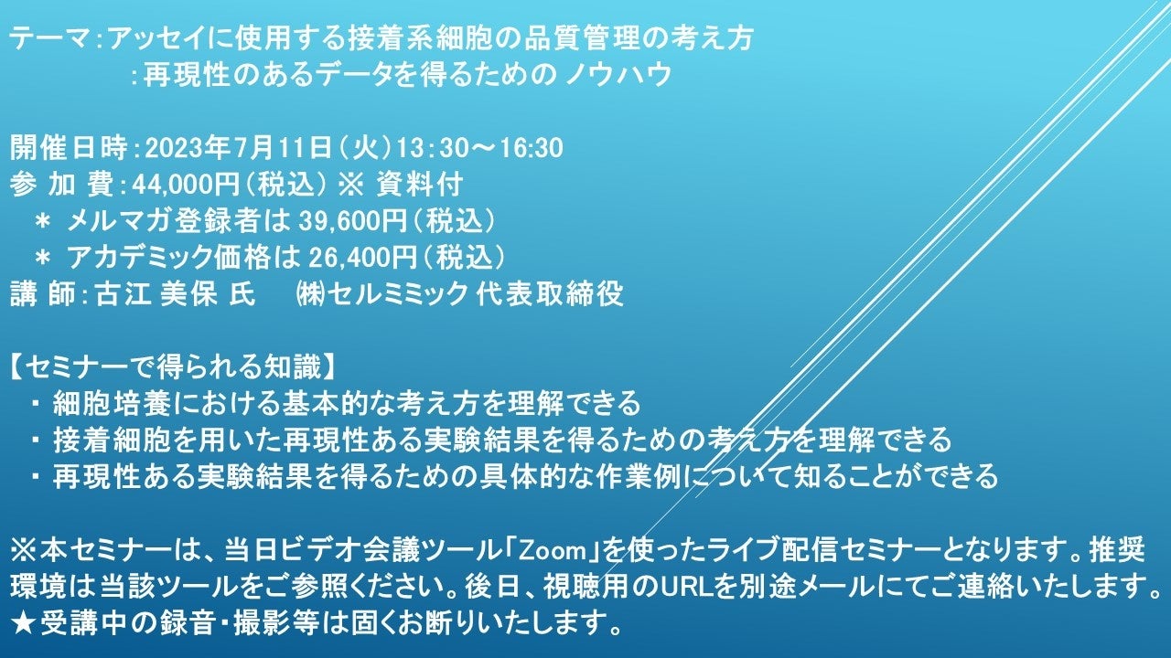 【ライブ配信セミナー】アッセイに使用する接着系細胞の品質管理の考え方:再現性のあるデータを得るための ノウハウ 7月11日(火)開催 主催:(株)シーエムシー・リサーチ