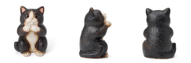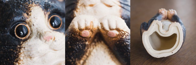 うるっと愛らしい瞳がこちらを見つめます。ぷっくりピンクの肉球にもこだわりました。中は空洞になっていて重さを軽減。土本来の風合いも楽しめます。